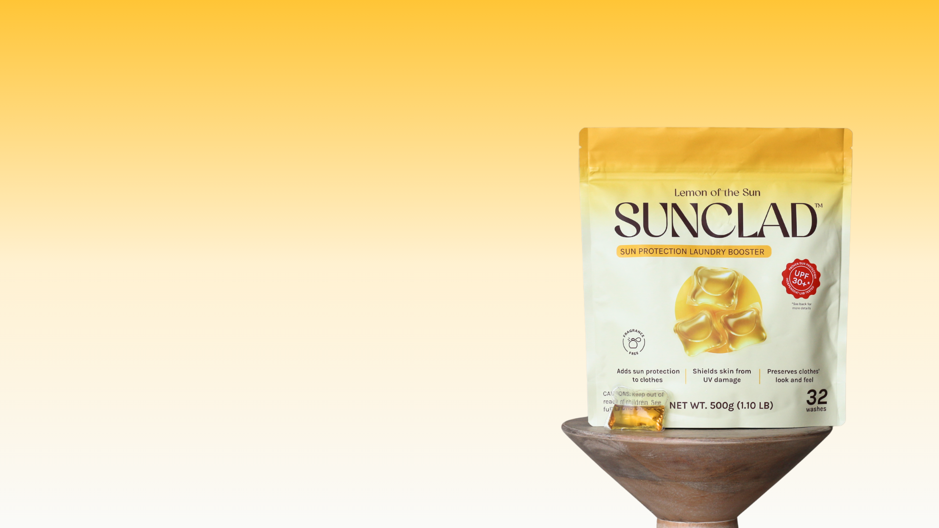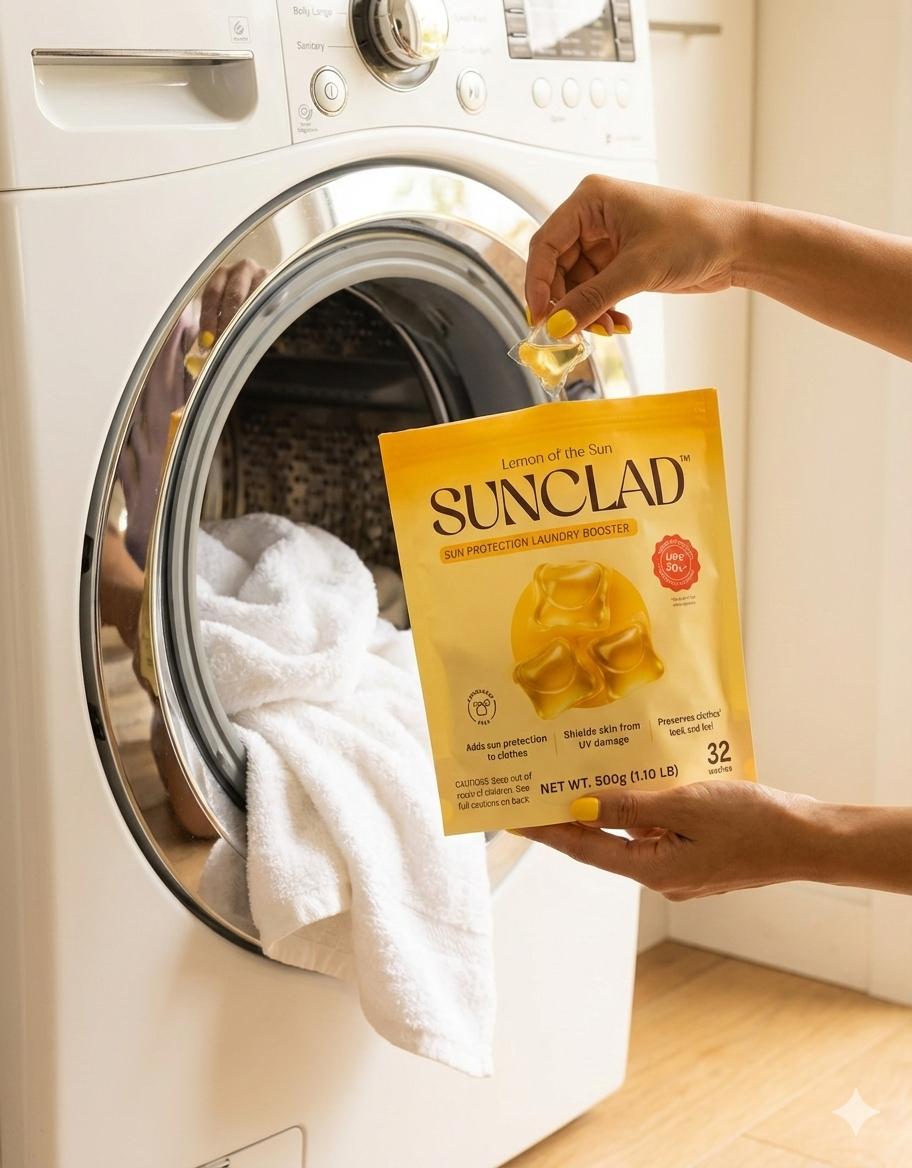 Patent pending sun protection laundry booster pod that adds invisible UV protection to your clothes as you wash, turning your clothes into UPF30+ sun armor.
